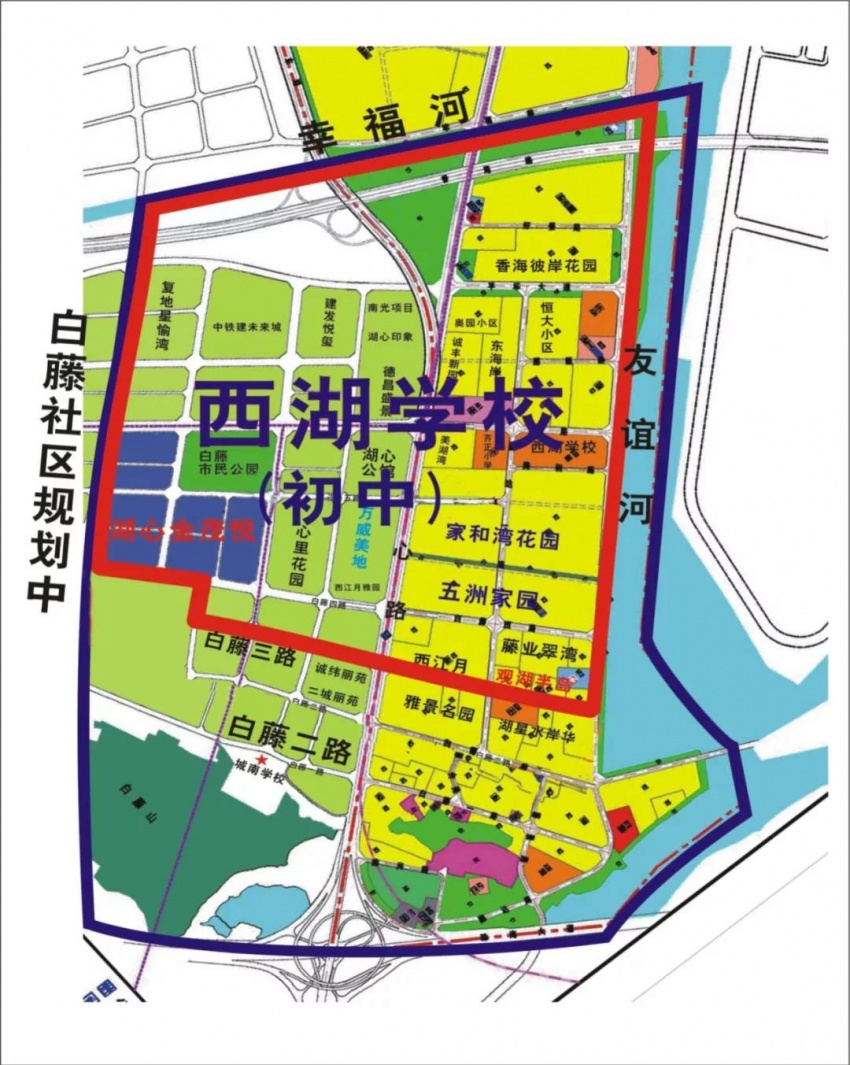 东至友谊河、西至翠湖路(规划中)、南抵白藤三路,北至幸福河。(注:白藤三路以南归属城南学校初中部学区)。
