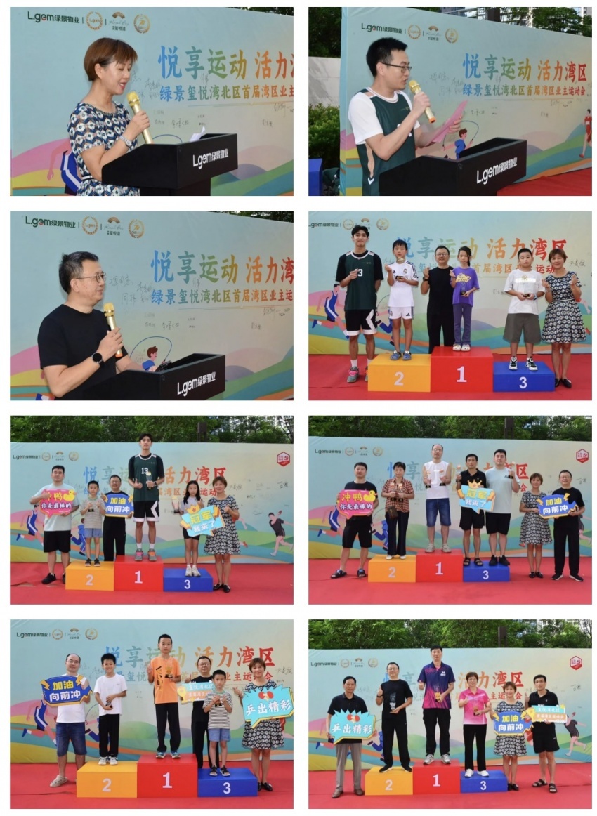 8月30日下午,绿景玺悦湾北区“首届湾区业主运动会”闭幕式在北区1栋前盛大举行。社团代表与运动选手代表分享参与感受,随后颁奖环节开启,业主嘉宾手持奖杯上台,纷纷为三大赛事冠亚季军颁奖。