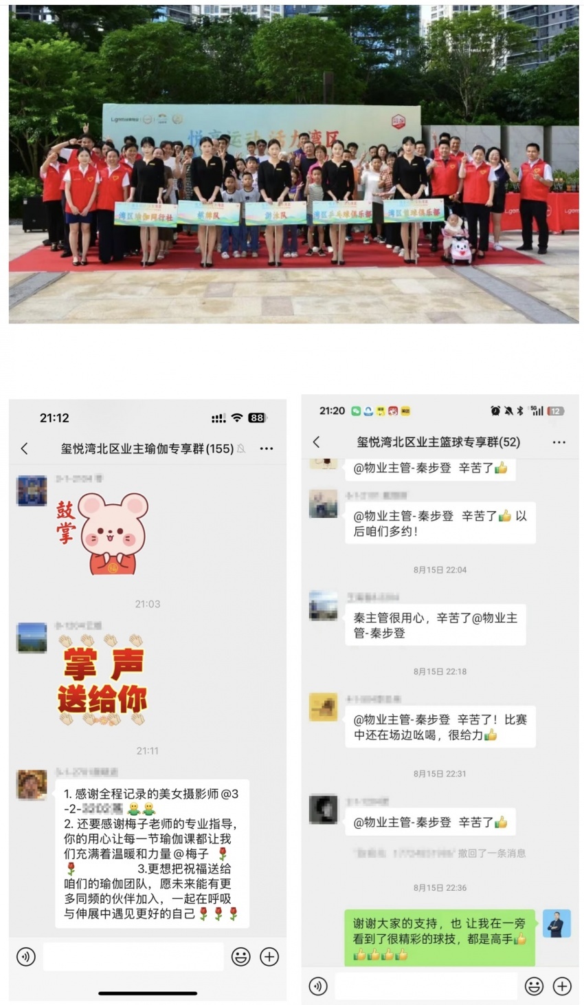 2025年,绿景玺悦湾北区持续打造并完善“悦享生活”服务生态体系,其中,在社区活动的规划与组织方面,陆续开展迎新年活动、闹元宵活动、学雷锋红色物业志愿者服务日活动、湾区女神节活动、植树节活动、美丽湾区倡议活动、湾区图书漂流站启动仪式、“湾区瑜伽同行社”开班启动仪式、“端午、六一儿童节”活动、助力高考加油活动、建军节慰问等活动。自5月10日成立湾区瑜伽同行社起,陆续对乒乓球场地进行了升级打造,对健身器材进行了维修加固,同时成立了篮球社团,适时筹备组织了系列业主竞技活动,历经三个月,于8月30日,绿景玺悦湾北区运动季暨首届湾区业主运动会圆满落幕,本次运动季涵盖多元配套赛事、社团风采展示及开学季趣味运动会,运动季累计服务超2000人次。