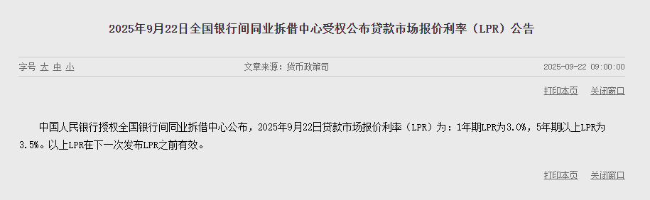 9月22日,央行发布最新的贷款市场报价利率(LPR),其中5年期以上LPR为3.50%。