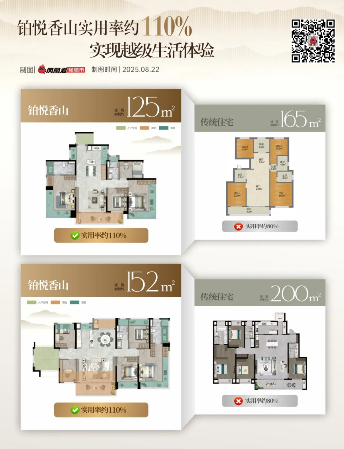 铂悦香山则更进一步,不仅实现约110% 的实用率,在空间尺度与居住舒适度上持续升级,更从多维度精准发力,将“全维度美好生活场景” 融入居所之中。