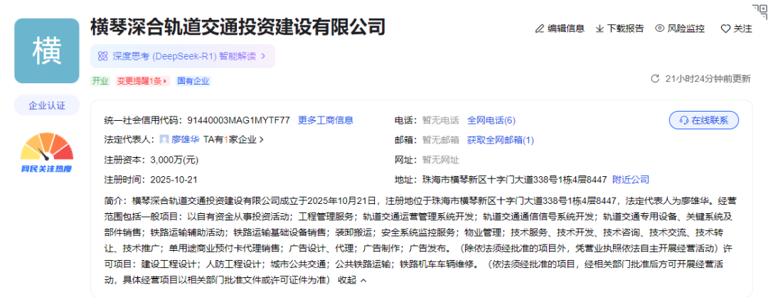 近日,横琴深合轨道交通投资建设有限公司成立,注册资本3000万元,注册地址位于珠海市横琴新区十字门大道338号。