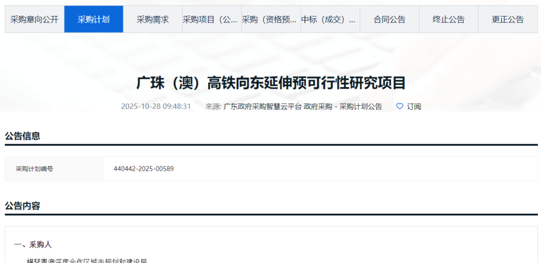 今日(10月28日),凤凰君留意到广东省公共资源交易平台发布《广珠(澳)高铁向东延伸预可行性研究项目》。