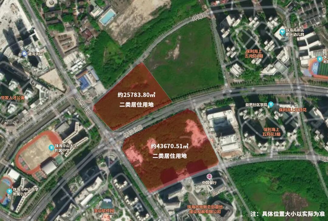 据公告显示,这两宗二类居住用地皆位于珠海高新区前环半岛,位置相近,与保利海上五月花1期相邻。