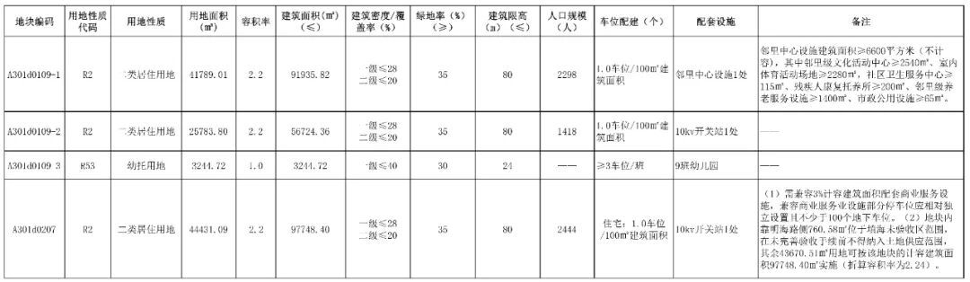 其中:A301d0109-2二类居住用地(地块1),规划用地面积25783.80㎡,容积率2.2,建筑面积56724.36㎡,绿地率≥35%,建筑限高≤80米,人口规模1418人。