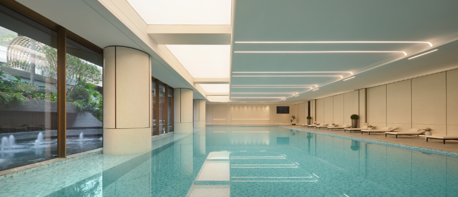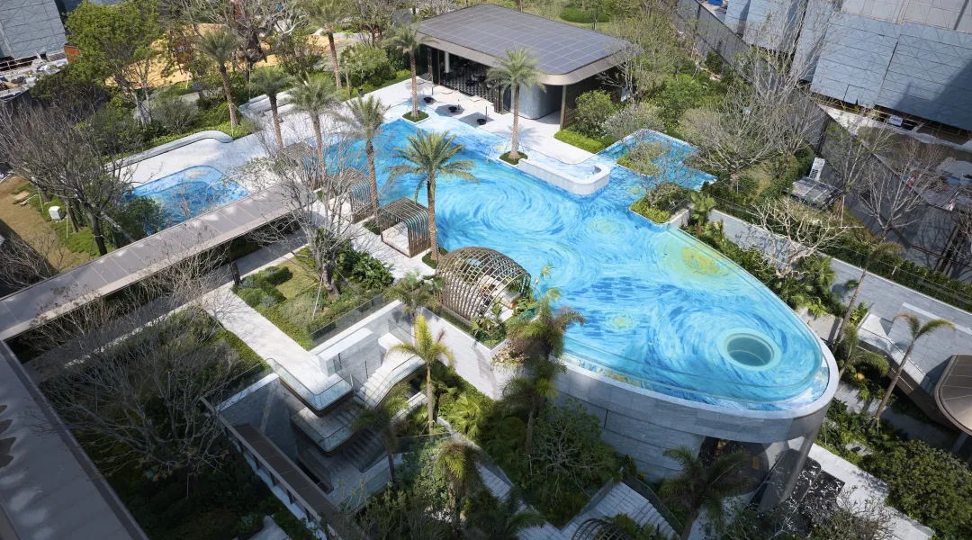 于泳池底部以艺术夜光马赛克镶贴出梵高名画《星月夜》,池畔奢配日咖夜酒会客厅,让“下楼即度假”照进日常。