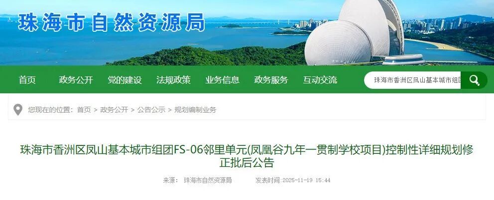 今日(11月19日),凤凰君留意到珠海自然资源局发布《珠海市香洲区凤山基本城市组团FS-06邻里单元(凤凰谷九年一贯制学校项目)控制性详细规划修正批后公告》