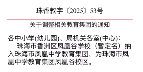 通知中明确提到,珠海市凤凰谷学校(暂定名)纳入珠海市凤凰中学教育集团,为珠海市凤凰中学教育集团凤凰谷校区。